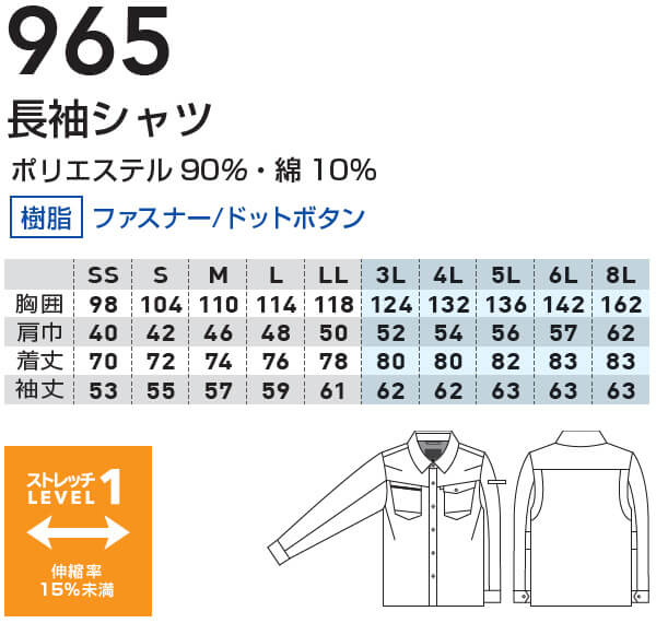 機能説明 信頼の日本製サマー裏綿を使用 窮屈感を感じさせない適度なストレッチ性 レディースサイズ対応商品 生地裏側の肌離れが良くベタつきにくい JIS T8118 規格適合の制電性商品 不快なニオイを軽減するデオドラントテープ付き スペック メーカー 桑和(SOWA) 品番/シリーズ 965 969/961シリーズ シーズン 春夏用 ※このシリーズの秋冬用商品はコチラ 商品名 長袖シャツ&スラックスセット(上下同色) 素材 ポリエステル90%・綿10%(裏綿) 機能 二重織、制電性素材、ストレッチ、消臭、イージーケア、レディース対応、野帳ポケット(シャツのみ) カラー 1.ネイビー 4.ブラック 8.ブルー 22.シルバーグレー 87.ライトブラウン 107.モスグリーン 109.ダークグリーン サイズ 長袖シャツ:SS〜8L スラックス:GS〜G3L、70cm〜130cm ※3L/91cm〜100cm以降は割り高になります。